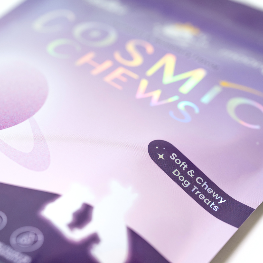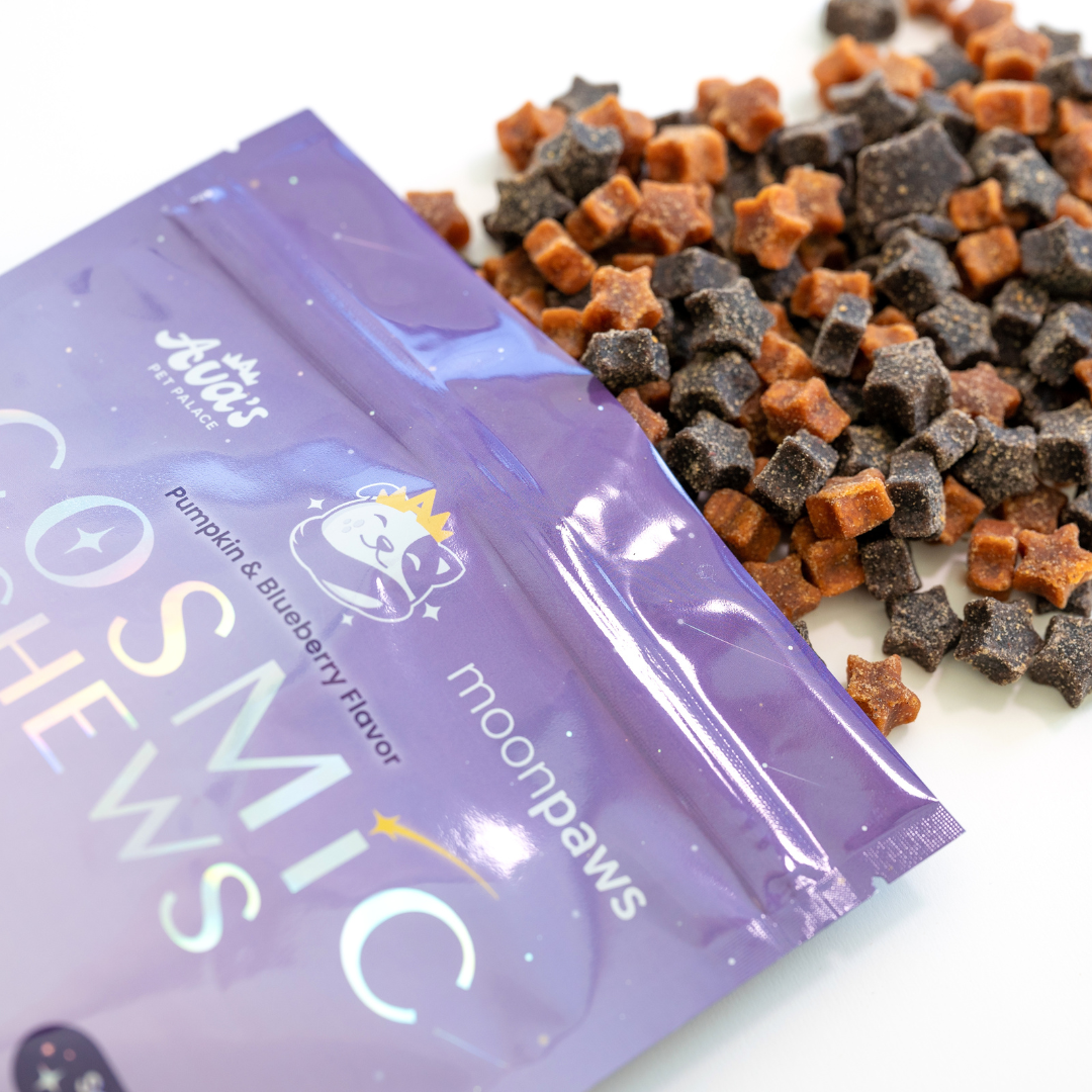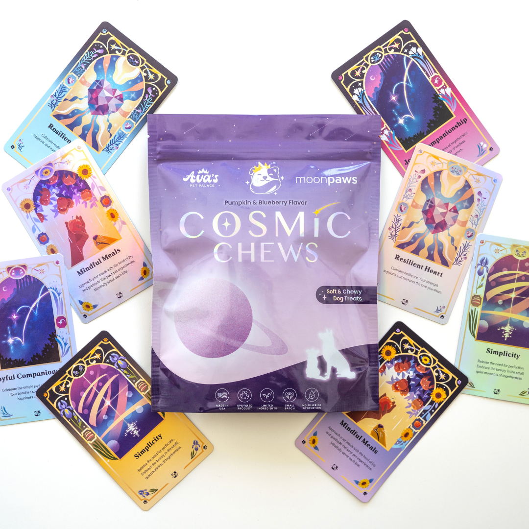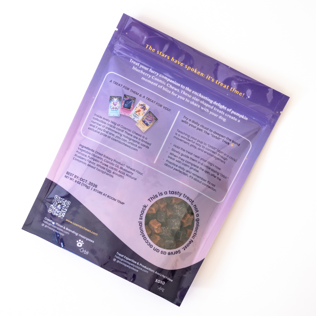 The result is Cosmic Chews — the first astrology-inspired, soft and chewy treat made with upcycled ingredients. Each recipe has more than our usual 7 ingredients because we added special touches like upcycled bakery product, fruits, and spices to bring both flavor and function. More ingredients here doesn’t mean filler. It means more flavor, more sustainability, and more joy at treat time.