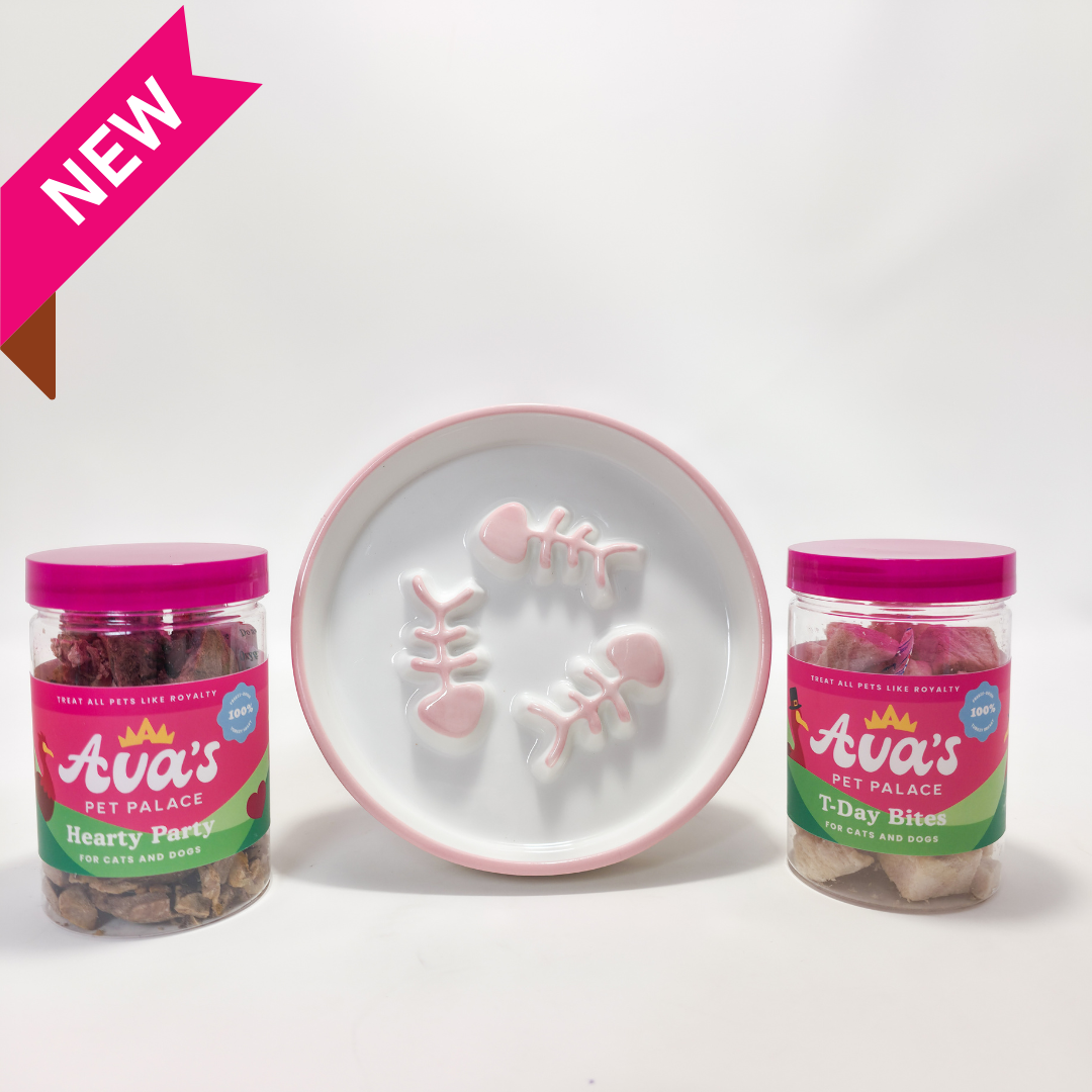 Freeze-dried turkey treats paired with a thoughtfully designed ceramic feeder bowl.