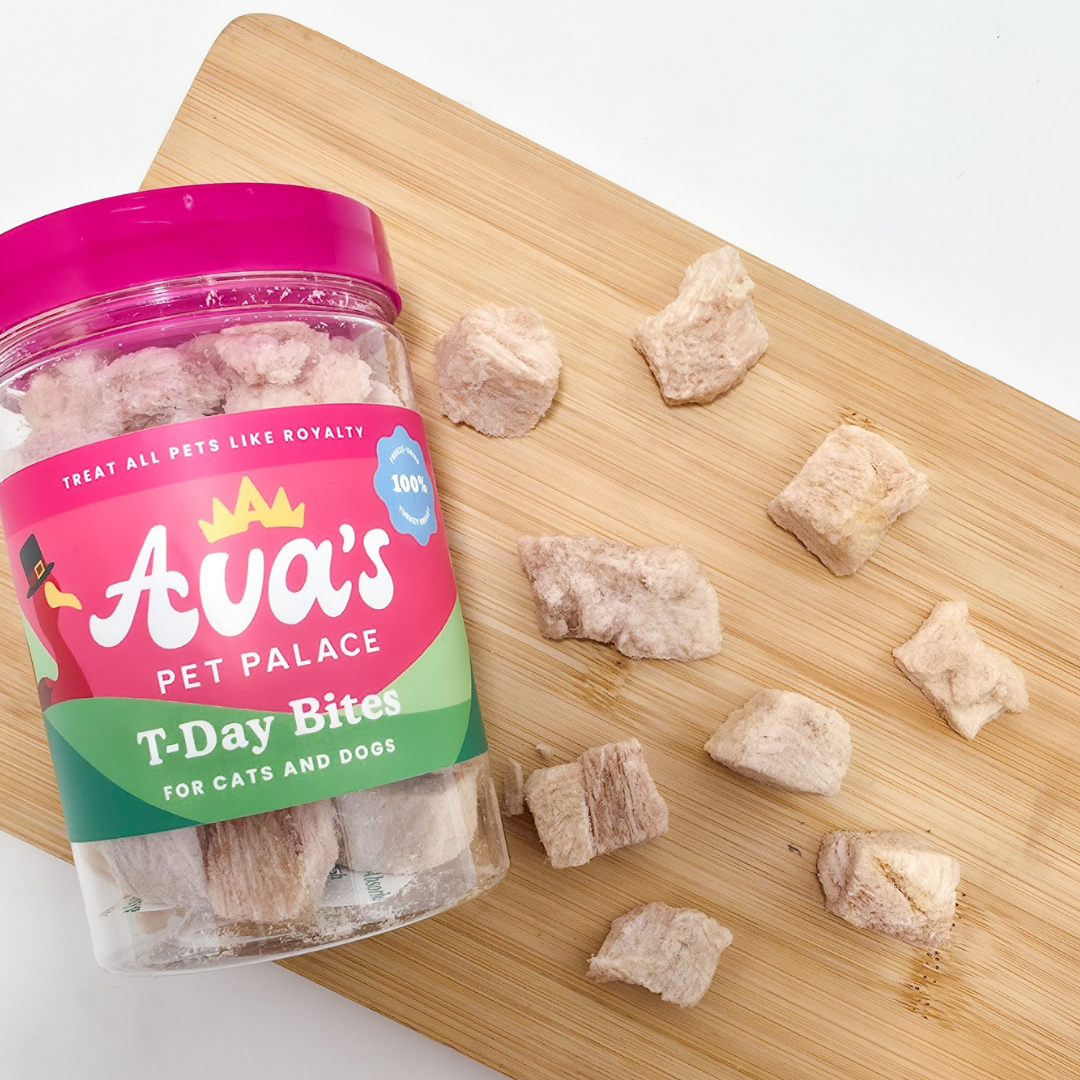 The Tasty Turkey Bundle features T-Day Bites, Hearty Party, and a ceramic feeder bowl. Both treats are made from real turkey and nothing else. T-Day Bites are freeze-dried turkey breast, offering lean, easy-to-digest protein in perfectly sized pieces. Hearty Party is made from freeze-dried turkey heart, a nutrient-dense organ meat packed with naturally occurring vitamins and minerals.